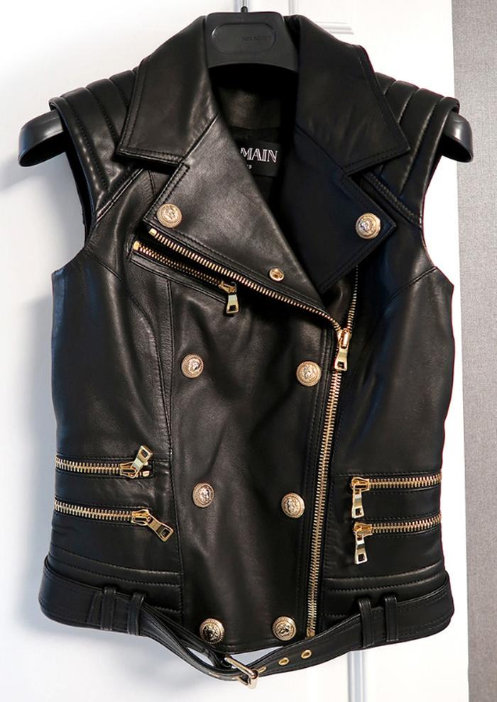 [2020] [BALMAIN] Black Leather Vest Gold Zippers and Buttons